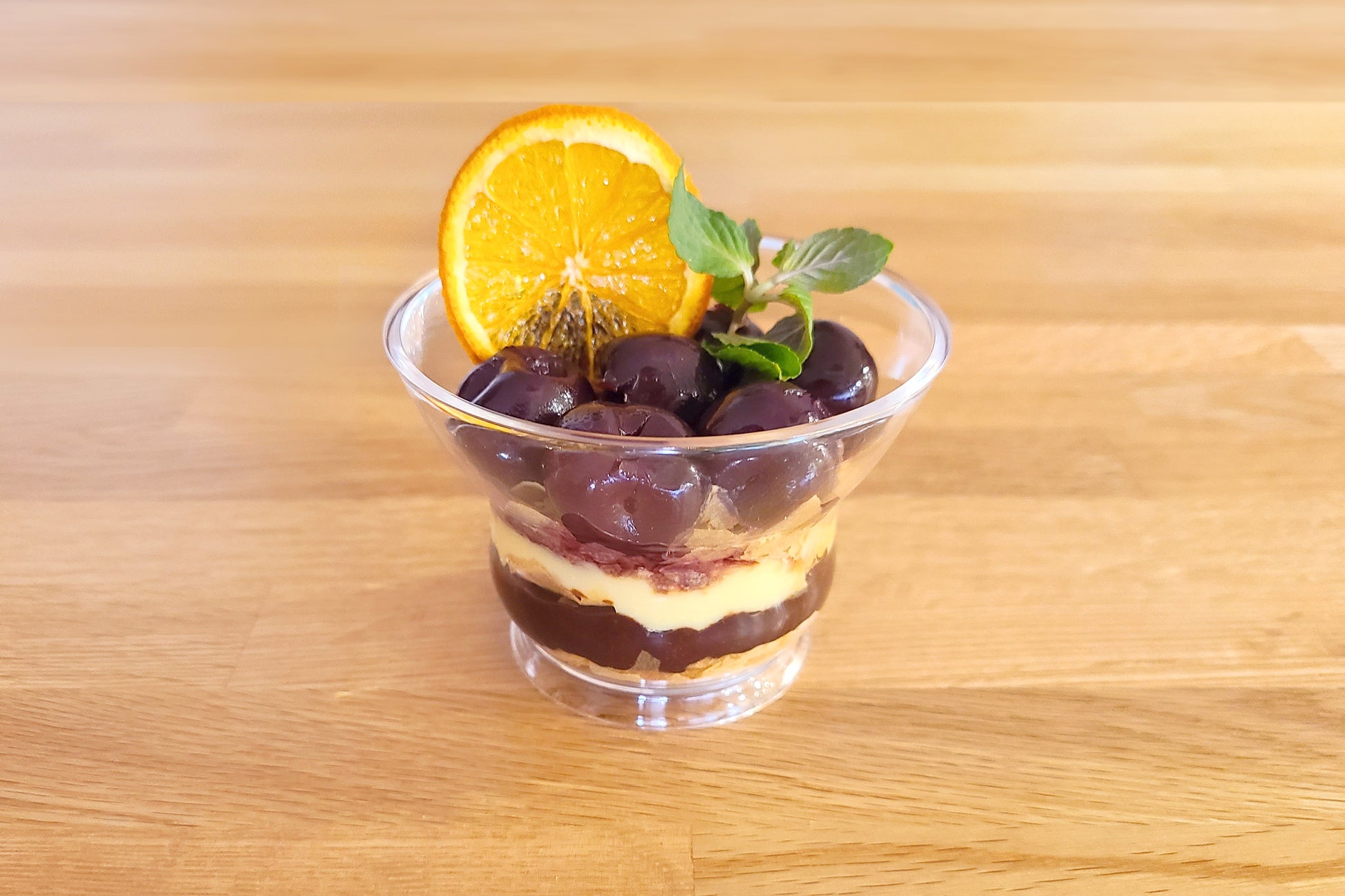 ジューシーで大粒のダークチェリーに濃厚なカスタードやチョコクリーム、サクサクのパイフレークなど、さまざまな味と食感がお楽しみいただけるミニパルフェです。